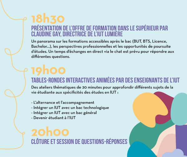 Cet événement vous offrira une vue d’ensemble des cursus accessibles après le bac, un zoom sur le BUT et des conseils pour vous orienter en IUT.
